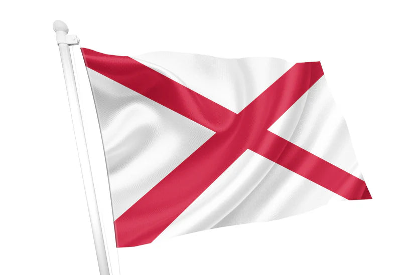 The Alabama State Flag features a striking St. Andrew’s Cross in crimson on a white background, representing the Confederate battle flag’s legacy and the state's deep history. Officially adopted in 1895, it remains a powerful emblem of Alabama’s pride and tradition.