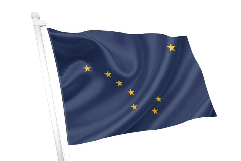 The Alaska State Flag features the Big Dipper and North Star set against a deep blue background, symbolising Alaska’s northern location and guiding spirit. Designed by 13-year-old Benny Benson in 1927, it represents the state’s history, identity, and celestial beauty. Officially adopted in 1959, it remains a powerful emblem of Alaska’s independence and natural wonders.