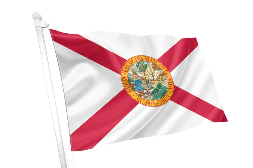 The Florida State Flag is a bold and historic emblem symbolising the Sunshine State's rich heritage, natural beauty, and Spanish influence. Its red diagonal cross (St. Andrew’s Cross) stands out against a white field, a design inspired by the Confederate Battle Flag and adopted in 1900 to distinguish it from plain white flags that could be mistaken for a sign of surrender.